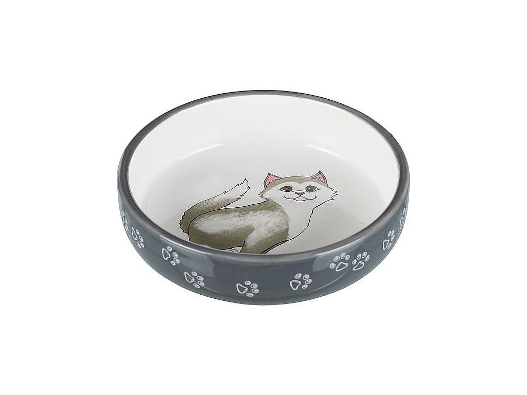 Bowl, flat, cat/paws, ceramic, 0.3 l/ø 15 cm, grey/white