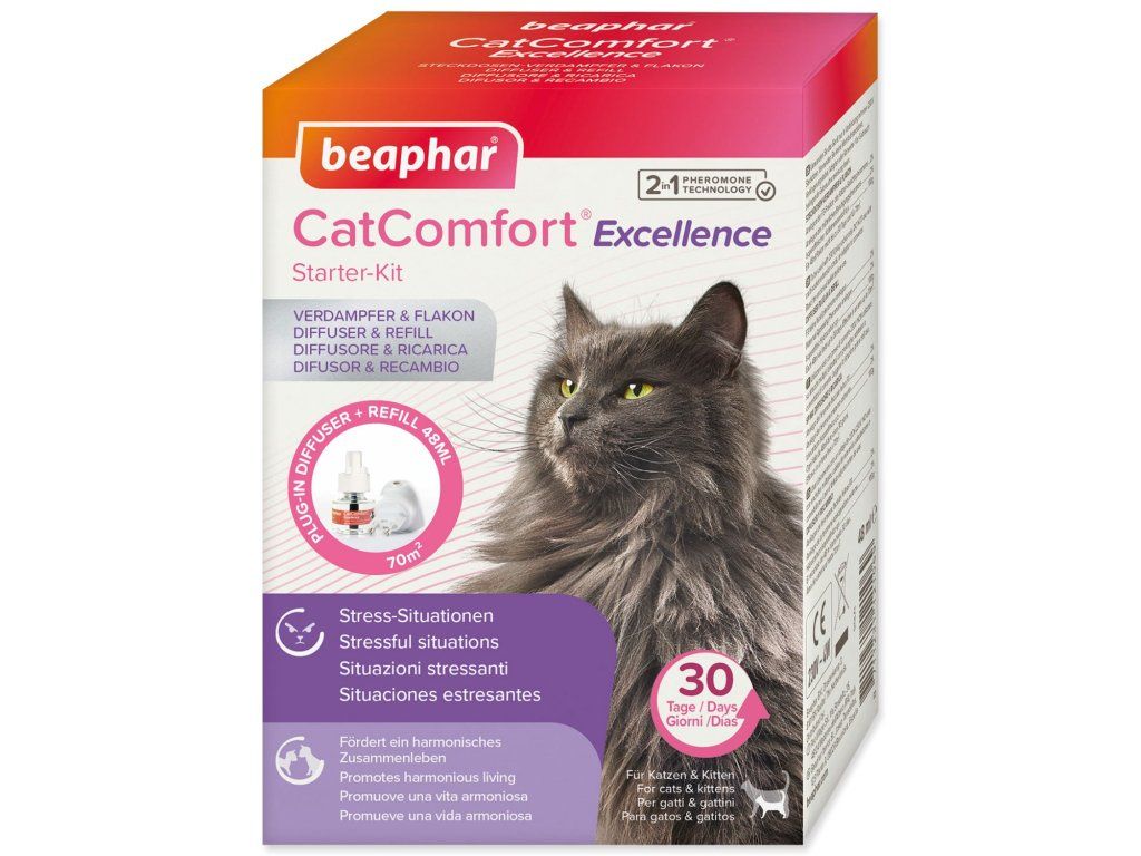 Difuzér CatComfort Excellence pre mačky s upokojujúcimi feromónmi, sada s náplňou 48 ml. Znižuje stres a úzkosť mačiek.