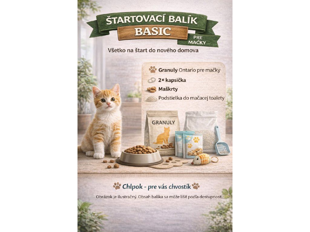 Mačka doma? Toto je najpraktickejší štart – jedlo aj toaleta vyriešené. Ontario pre mačky (menšie balenie ~2 kg) 2× kapsička Maškrty Hračka Podstielka do mačacej toalety Balík skladáme z produktov, ktoré má Chlpok v ponuke. Výhodnejšie než nákup zvlášť. Dostupnosť: 3–5 dní (skladáme po objednávke).