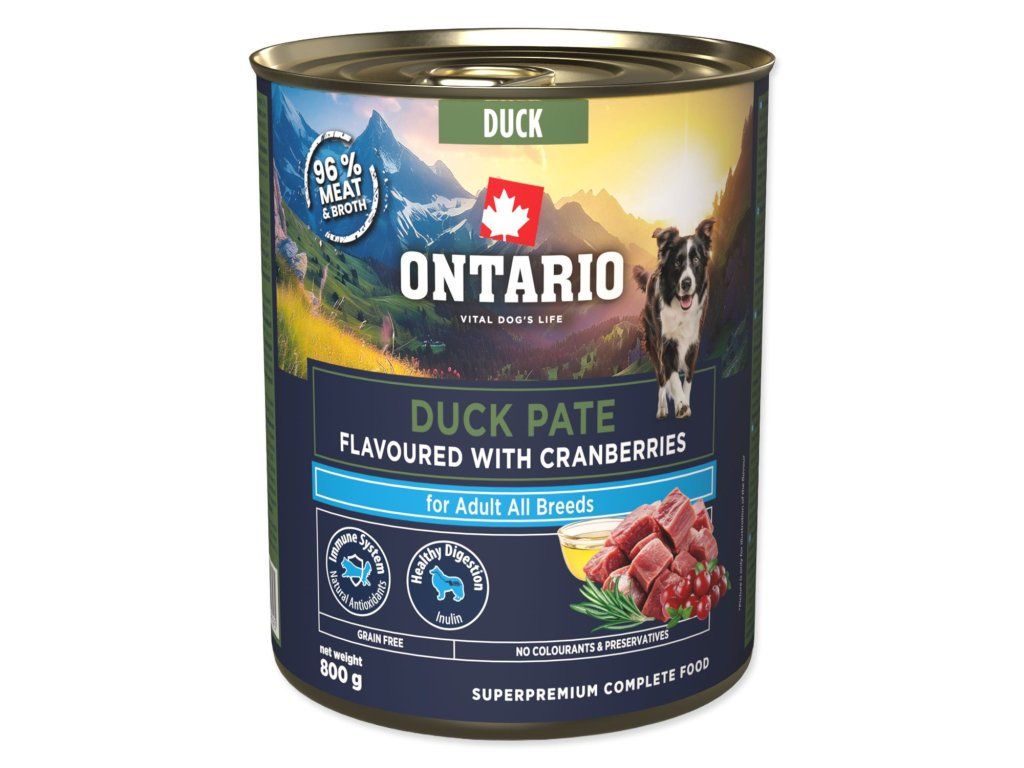 Konzerva Ontario Adult kačacie paté s príchuťou brusiniek800g. Jemné paté/konzerva s dôrazom na chuť a dobrú stráviteľnosť. Balenie: 0.8000 kg.