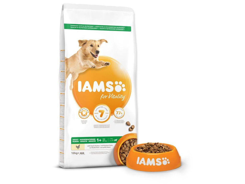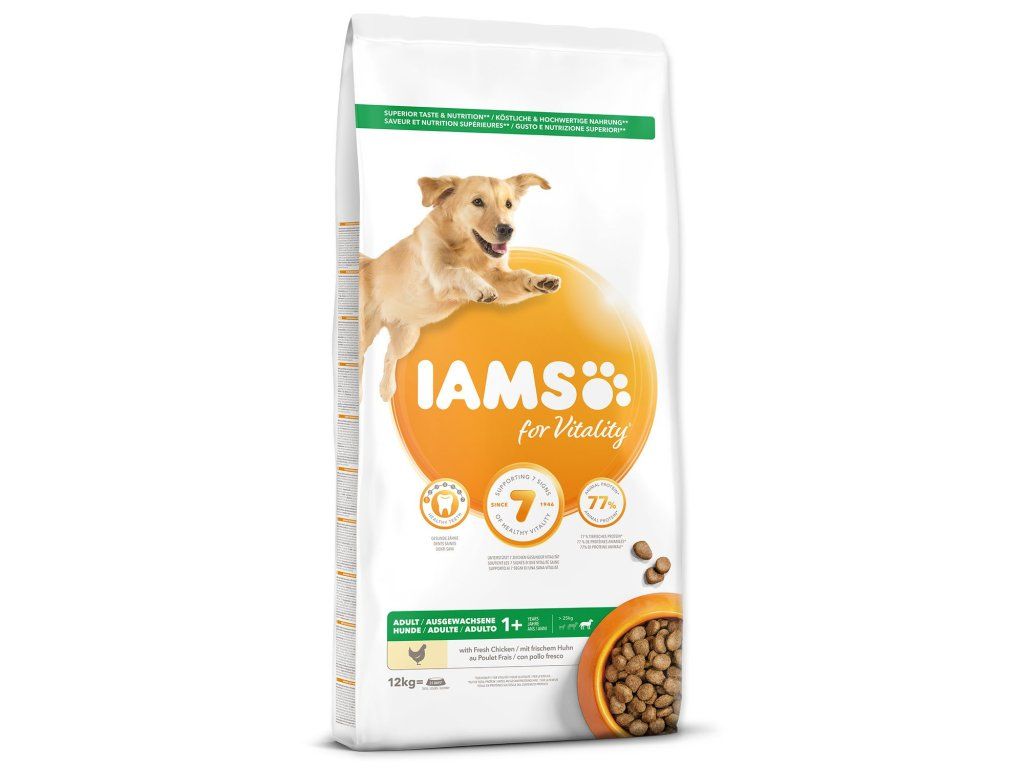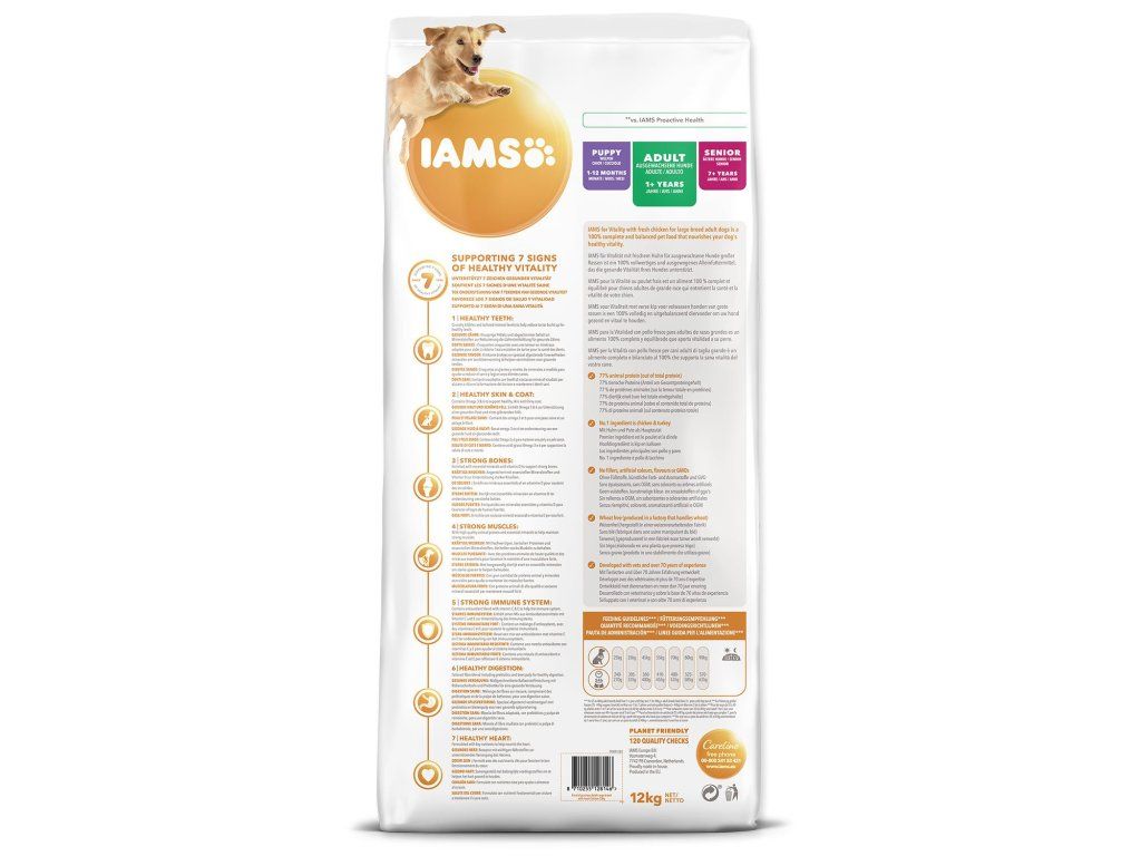Krmivo IAMS for Vitality pre dospelých psov veľkých plemien je 100% kompletné a vyvážené, odborníkmi zostavené krmivo, ktoré bude vášmu zvieraťu chutiť a svedčiť. Naša nová a vylepšená receptúra ??pre dospelých psov s čerstvým kuracím mäsom je založená na kvalitných živočíšnych bielkovinách, ktoré boli starostlivo vybrané, aby podporovali sedem znakov zdravej vitality psa. Aby bol váš pes zdravý, aktívny a plný energie, obsahujú naše lahodné receptúry až 77% živočíšnych bielkovín (z celkového obsahu bielkovín).