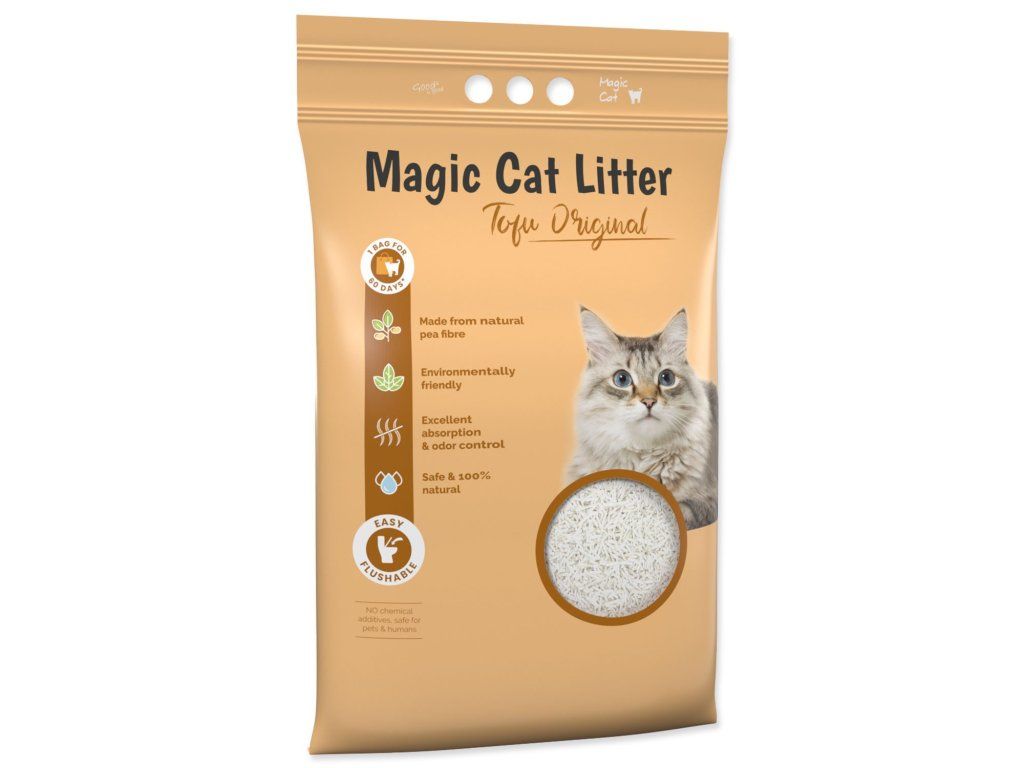 Je úplne bez chemických prísad, netoxické a s úžasnou schopnosťou absorpcie vlhkosti. Hrudky môžete jednoducho spláchnuť do toalety. S Magic Litter Tofu zaistíte svojej mačke čisté a zdravé prostredie, v ktorom sa bude cítiť skvele. Jedno balenie vydrží pri používaní jednou mačkou až 30 dní.