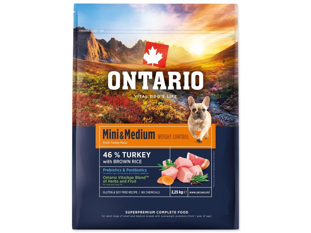 Krmivo Ontario Mini & Medium Weight Control Turkey & Brown Rice 2,25kg
