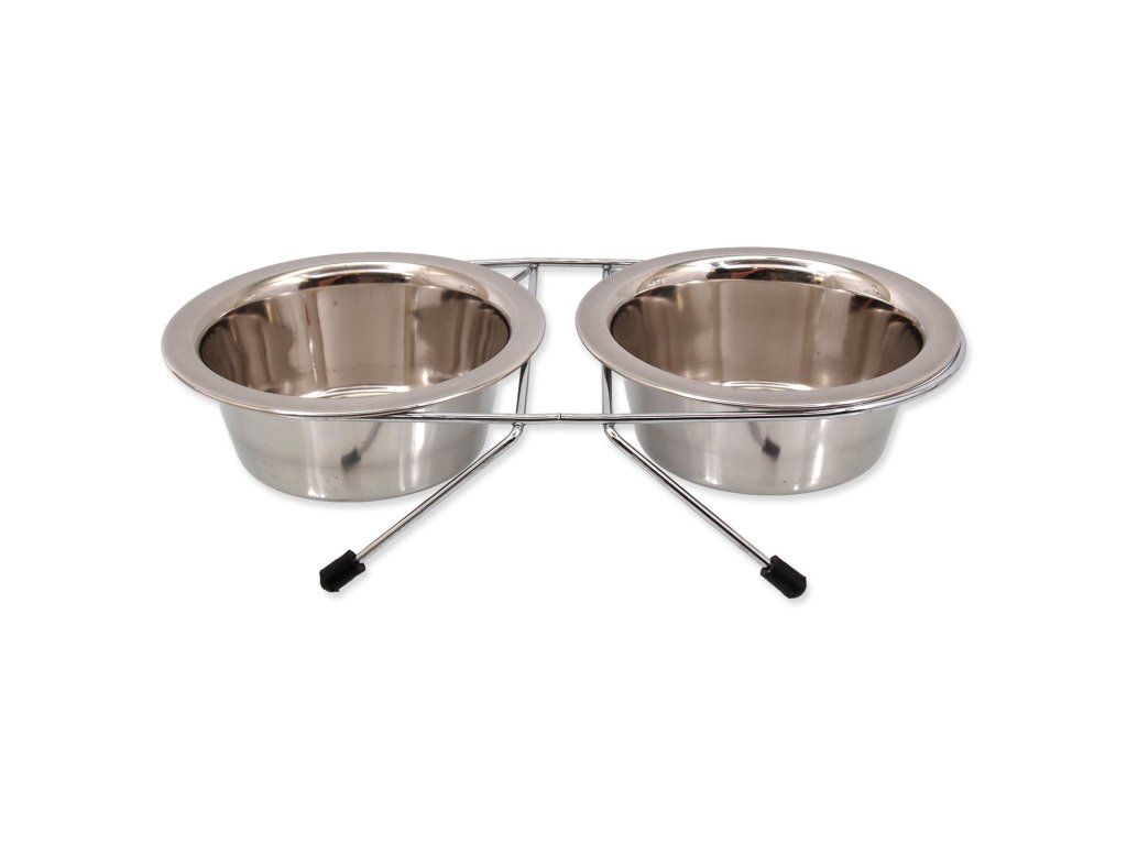 Nerezové misky v stojáne pre malé psy a mačky. Kvalitný materiál Protišmyková úprava Veľkosť: 13cm, 2 x 0,38 l
